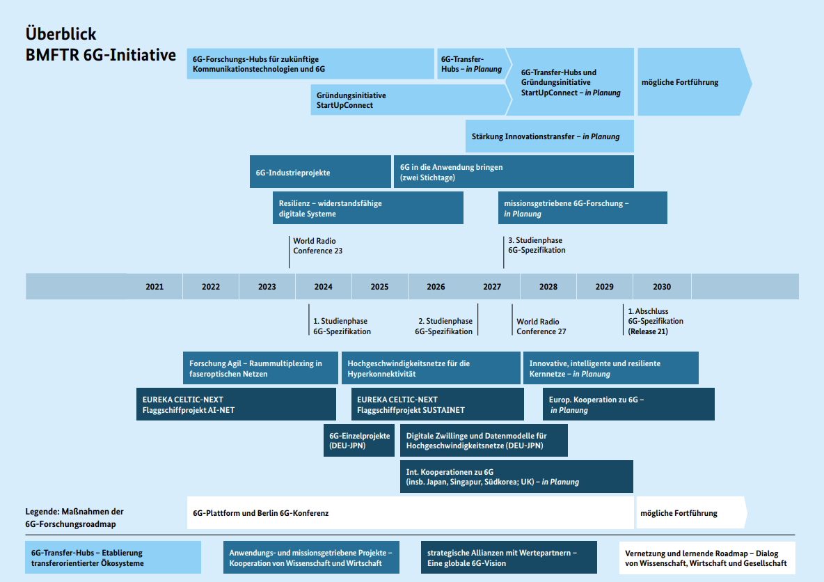 Inhaltlich baut die Roadmap auf der 6G‑Forschungsinitiative der Jahre 2021–2025 auf und wurde in Abstimmung mit den betroffenen Bundesressorts sowie Expertinnen und Experten aus Wissenschaft und Wirtschaft erarbeitet. Während in der Forschungsinitiative unter anderem 6G-Forschungs-Hubs unterstützt wurden, markiert die 6G-Forschungsroadmap nun den nächsten Schritt hin zum Transfer in die Praxis und zu konkreten Anwendungen: Seit Anfang 2026 wurden neue regionale und überregionale 6G-Transfer-Hubs mit einer Förderung von bis zu 200 Millionen Euro durch das BMFTR, das Sondervermögen Infrastruktur und Klimaneutralität sowie der beteiligten Bundesländer gestartet und bestehende Labore weiter ausgebaut, so das zuständige Bundesministerium