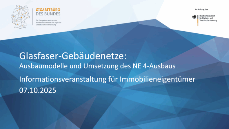 Das Gigabitbüro des Bundes bietet zum Ausbau von Glasfaser-Gebäudenetzen kostenlose Schulungen für Hausverwaltungen und die Wohnungswirtschaft an. In der Schulung insbesondere werden Themen wie Ausbaumodelle, Kosten, rechtliche Rahmenbedingungen und praktische Tipps behandelt.