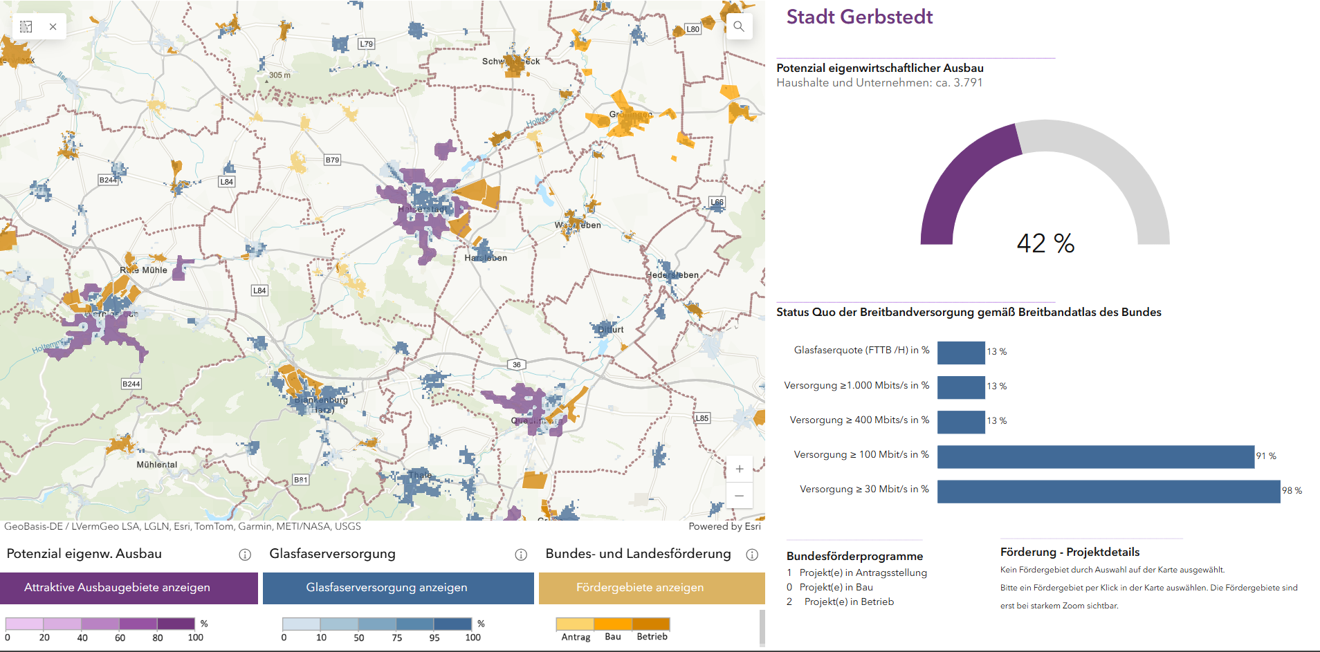 - Ergänzungen durch Informationen aus dem Breitbandatlas: Die Glasfaserversorgung sowie aktuelle Ausbauprojekte aus der Bundesförderung werden basierend auf den Daten aus dem Breitbandatlas angezeigt.