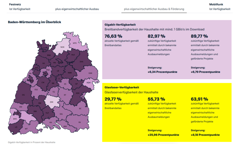 Daniel Röck: Laut Breitbandatlas des Bundes liegt die Gigabitverfügbarkeit bei uns in Baden-Württemberg derzeit bei 76,63 % über alle Technologien hinweg. Das bedeutet, dass rund drei von vier Haushalten bereits Zugang zu einem Gigabitanschluss haben. Gleichzeitig befinden sich viele Projekte noch im Bau oder in Planung. Diese sind in den aktuellen Statistiken häufig noch nicht sichtbar. Deshalb ist es wichtig, neben dem momentanen Stand auch die kommenden Ausbauprojekte zu betrachten.