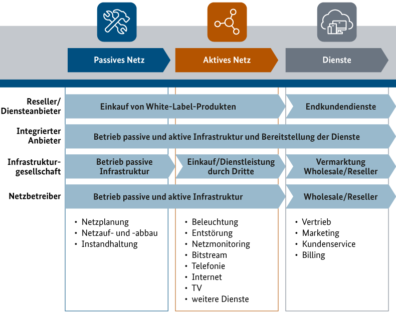 Von zentraler Bedeutung für das Vorhaben ist das angestrebte Geschäftsmodell, denn daraus ergeben sich der Finanzierungsbedarf und das Risiko des Vorhabens. Die nachfolgende Darstellung zeigt die geläufigsten Geschäftsmodelle im Telekommunikationsmarkt entlang der drei wesentlichen Wertschöpfungsstufen: Passives Netz; Aktives Netz und Dienste.
